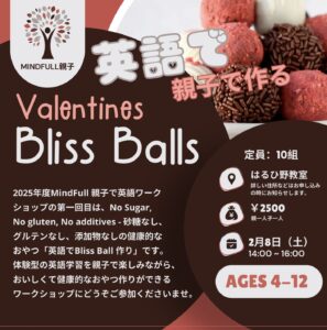 2025年度MindFull 親子で英語ワークショップの第一回目は、No Sugar, No gluten, No additives – 砂糖なし、グルテンなし、添加物なしの健康的なおやつ「英語でBliss Ball 作り」です。体験型の英語学習を親子で楽しみながら、おいしくて健康的なおやつ作りができるワークショップにどうぞご参加くださいませ。